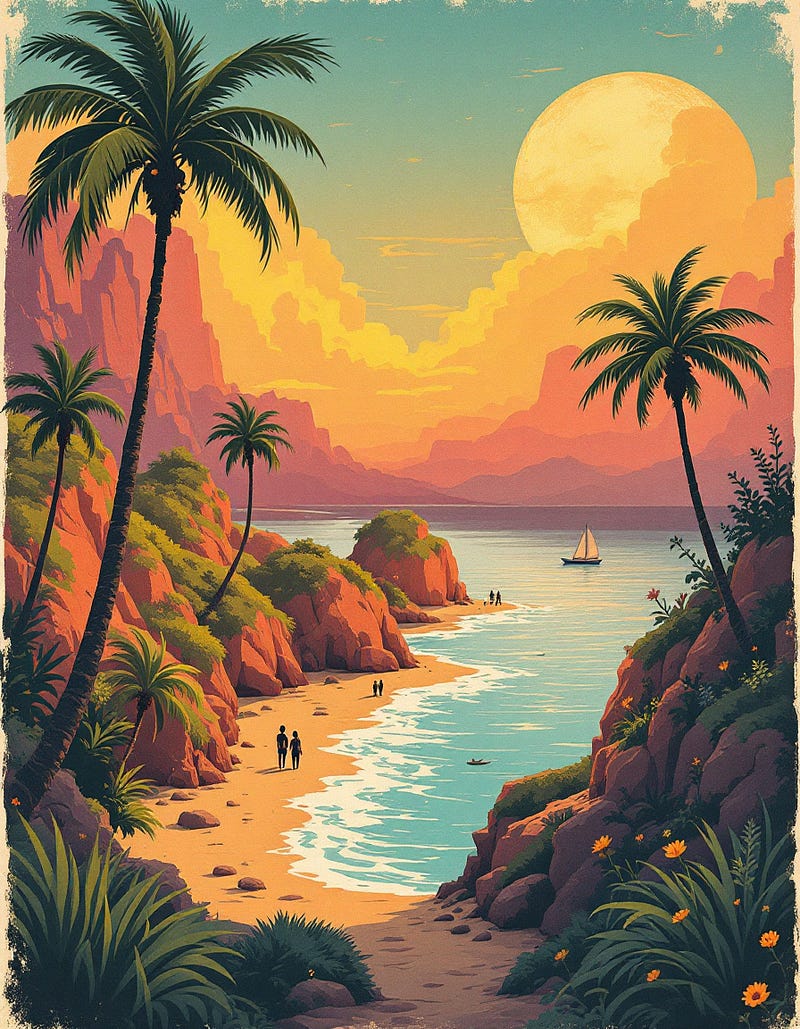 设计一张虚构目的地的旅行海报,展现与生动的2025年色彩完美融合的色调,唤起怀旧的感觉。