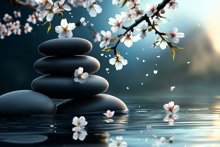 stones balanced by the shore. Cherry Blossoms