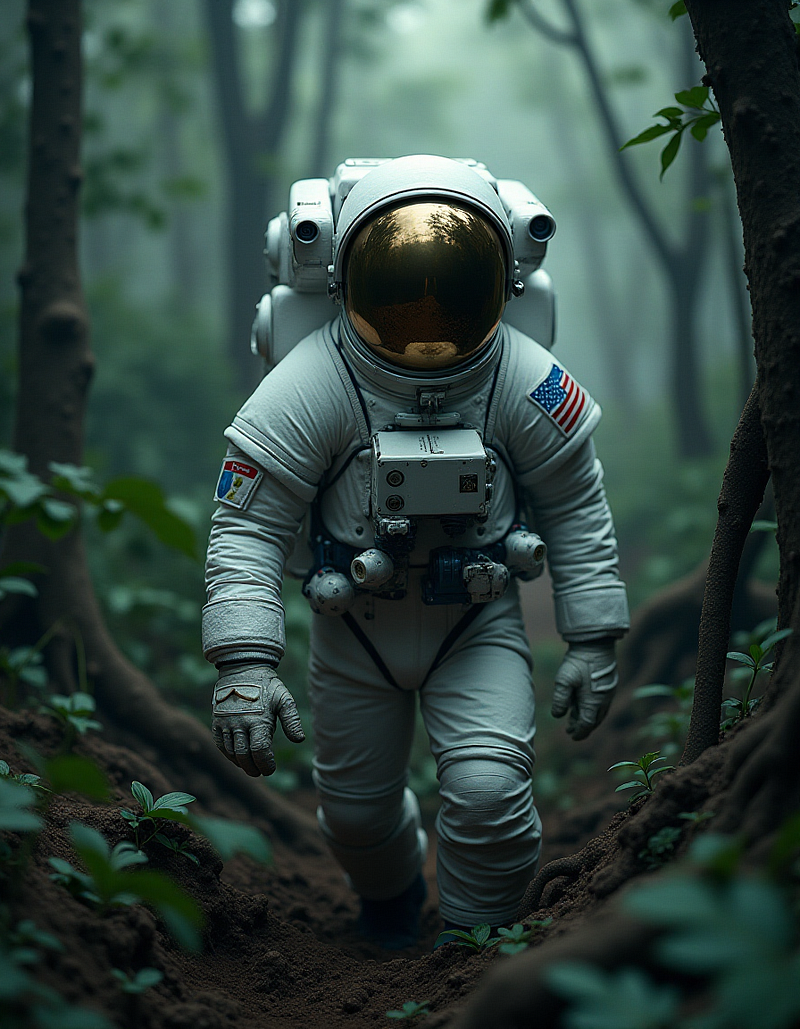 丛林中的宇航员,冷色调,柔和的颜色,非常详细,清晰聚焦