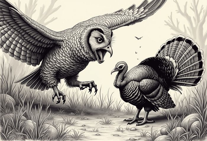 提示:自然中一只猫头鹰对着火鸡尖叫的钢笔与墨水插图